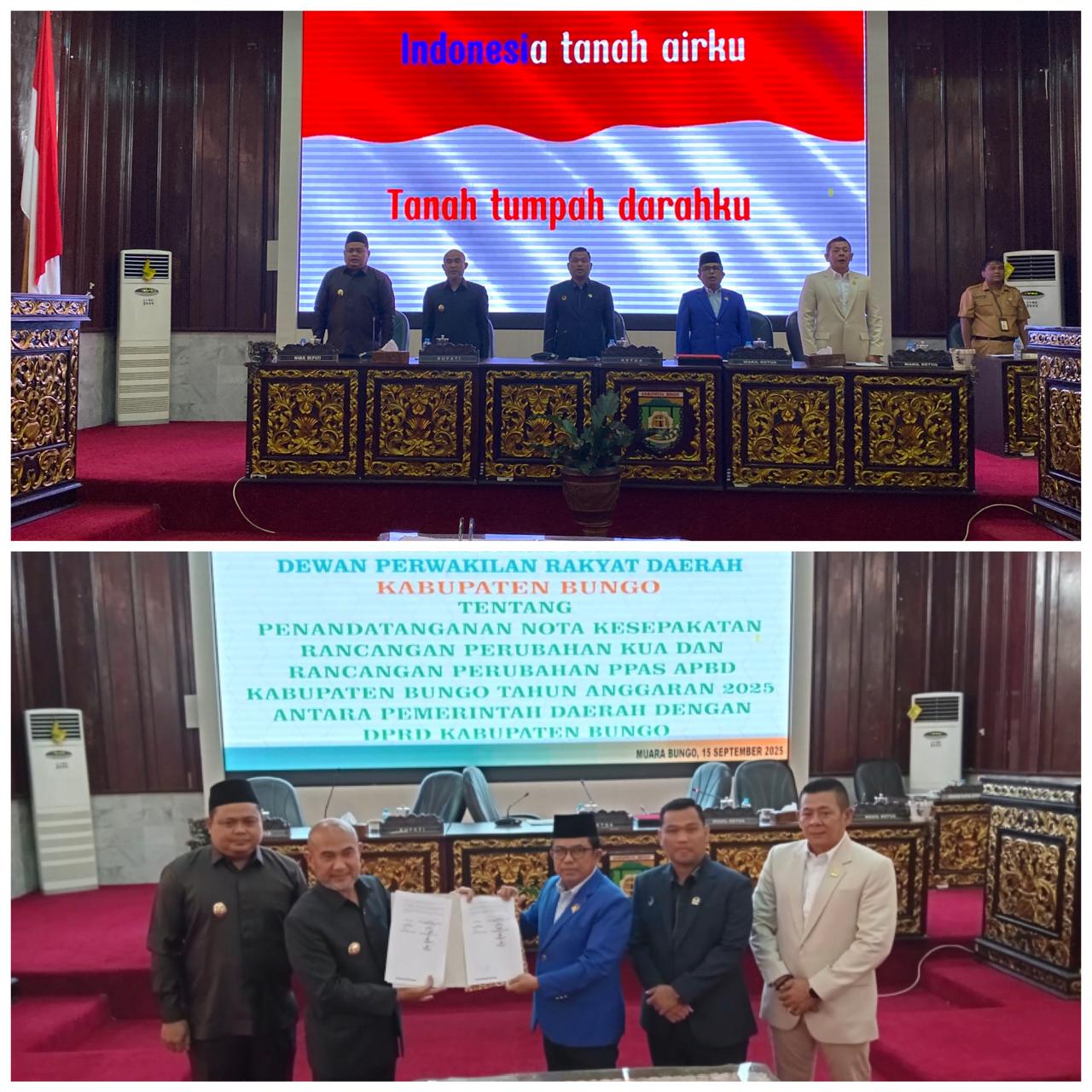 Tjnews,Bungo-Dewan Perwakilan Rakyat Daerah (DRPD) Kabupaten Bungo menggelarkan rapat paripurna Penandatanganan Nota Kesepakatan Rancangan Perubahan KUA dan Rancangan Perubahan PPAS APBD Kabupaten Bungo Tahun Anggaran 2025 antara Pemerintah Daerah dengan DPRD Kabupaten Bungo. Acara yang berlangsung di Ruangan Utama DPRD Kabupaten Bungo pada Senin 15 September 2025.