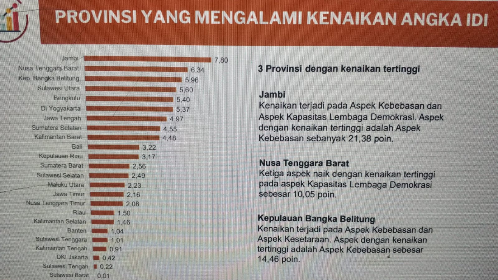 Menurut Direktur Statistik Ketahanan tersebut ada 3 provinsi yang mengalami kenaikan angka IDI yaitu Provinsi Jambi, Nusa Tenggara Barat dan Kepulauan Bangka Belitung. “Adapun Provinsi Jambi yang mengalami peningkatan yang paling tinggi kebebasan sebanyak 21,38 poin. Setelah itu disusul oleh Provinsi Nusa Tenggara Barat sebesar 10,05 poin dan Kepulauan Bangka Belitung meraih kebebasan sebanyak 14,46 poin,” kata Nurma Midayanti.
