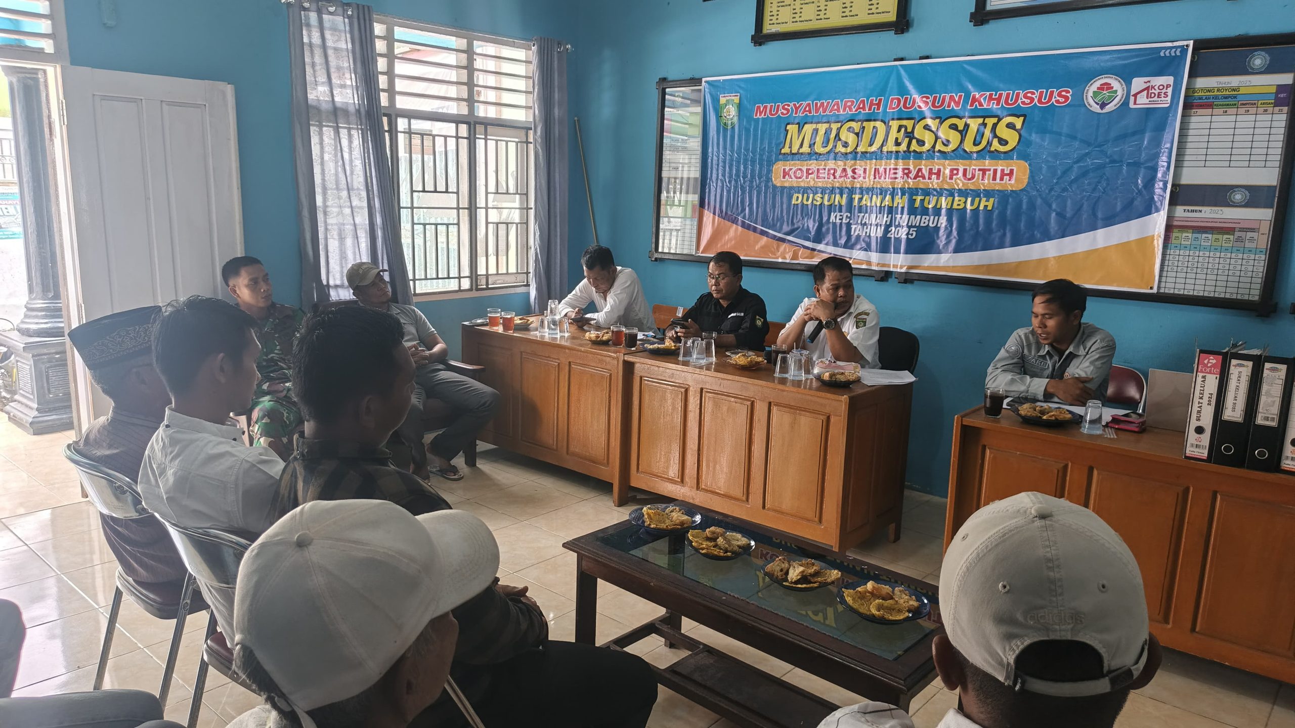 Rio Dusun Tanah Tumbuh Muhammad Saleh dalam sambutannya menyebutkan Musyawarah Desa (Musdes) berperan penting untuk menjamin pinjaman Koperasi Merah Putih, yang mekanismenya diatur oleh Permendesa PDT Nomor 10 Tahun 2025.