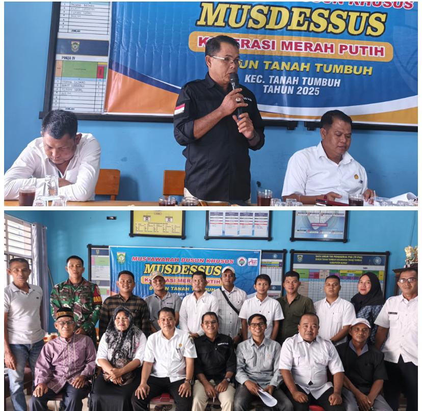 Tjnews,Bungo-Dalam semangat membangun ekonomi kerakyatan berbasis gotong royong, Pemerintah Dusun Tanah Tumbuh Kecamatan Tanah Tumbuh Kabupaten Bungo menggelar Musyawarah Desa Khusus (Musdessus) koperasi merah putih bertempat di kantor rio dusun tanah tumbuh pada rabu(22/10/25).