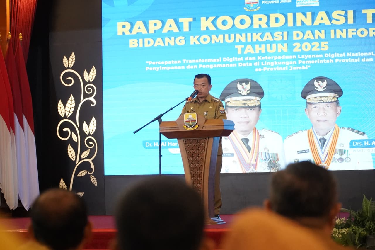 Tjnews,Jambi (Diskominfo Provinsi Jambi) – Gubernur Jambi Dr. H. Al Haris, S.Sos, MH membuka secara resmi Rapat Koordinasi Teknis (Rakortek) Bidang Komunikasi dan Informatika Provinsi Jambi Tahun 2025, bertempat di Auditorium Rumah Dinas Gubernur Jambi, Senin (03/11/2025) pagi. Rakortek ini bertema: “Percepatan Transformasi Digital dan Keterpaduan Layanan Digital Nasional, serta Pelayanan Penyimpanan dan Pengamanan Data di Lingkungan Pemerintah Provinsi dan Kabupaten/Kota se-Provinsi Jambi”.