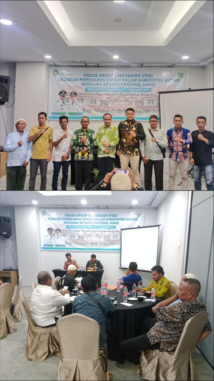 Tjnews,Bungo-Pemerintah Kabupaten Bungo melalui Dinas Pemberdayaan Masyarakat dan Desa (PMD),menggelar Focus Group Discussion (FGD) mengenai kegiatan pemekaran desa /dusun dalam Kabupaten Bungo dengan melibatkan Dinas Pemberdayaan Perempuan, Perlindungan Anak, dan Pengendalian Penduduk (DP3AP2) Provinsi Jambi Pada Kamis(18/25)dihotel Odua Weston Jambi.