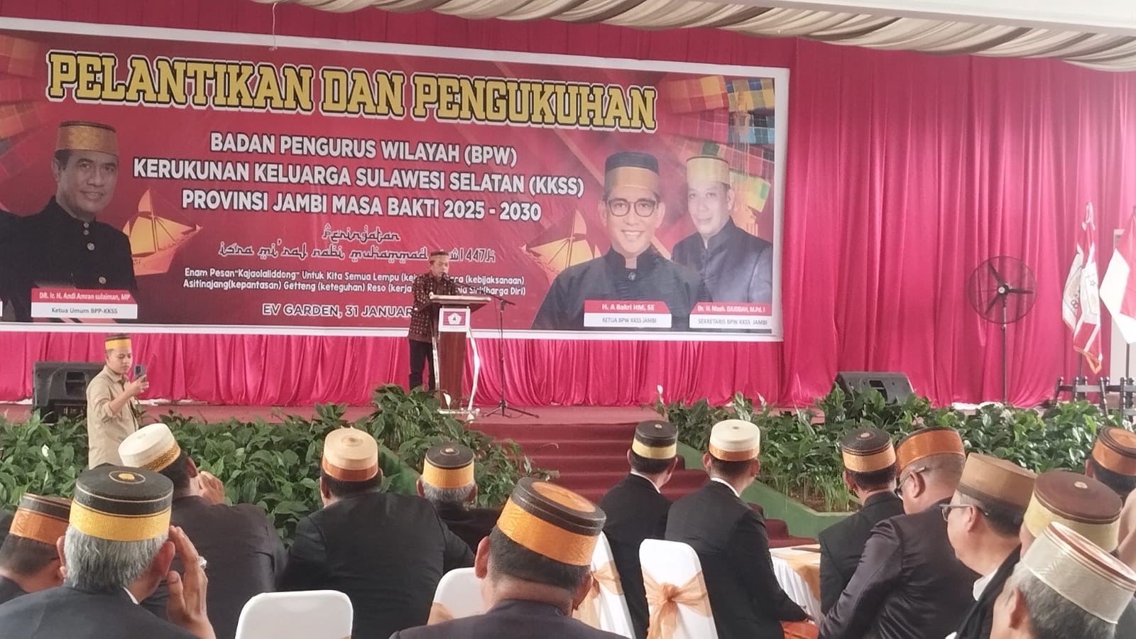 Tjnews,Jambi (Diskominfo Provinsi Jambi) – Gubernur Jambi Sr. H. Al Haris, S.Sos, MH menghadiri pelantikan Badan Pengurus Wilayah Kerukunan Keluarga Sulawesi Selatan (BPW KKSS) Provinsi Jambi Masa Bakti 2025-2030, Sabtu (31/01/2026), bertempat di Ev Garden. BPW KKSS Provinsi Jambi adalah organisasi kemasyarakatan yang mewadahi warga perantau asal Sulawesi Selatan di wilayah Jambi. Organisasi ini berfokus pada penguatan silaturahmi, pelestarian budaya (Bugis, Makassar, Mandar, Toraja), dan pembangunan daerah. Turut hadir pada kesempatan tersebut diantaranya anggota DPR RI H. Bakri dan tamu undangan lainnya.