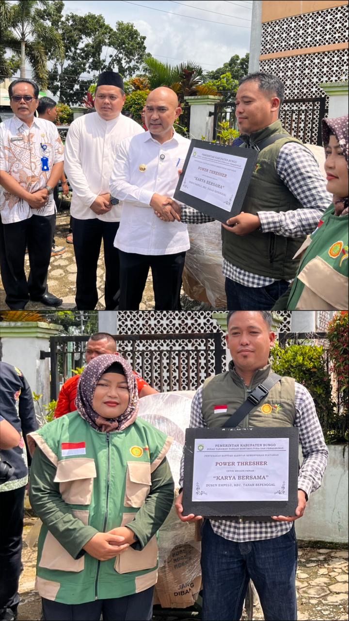 Tjnews,Bungo-Brigade Pangan Karya Bersama Kecamatan Tanah Sepenggal dibawah bimbingan Brigade Pangan Nopriyanti S.P kembali menerima bantuan power threser(alat perontok padi)dalam rangka peningkatan indeks pertanaman dan mendukung swasembada pangan berkelanjutan di kabupaten Bungo penyerahan bantuan berlangsung didinas TPH-Bun Bungo Pada Jumat(06/02/26).