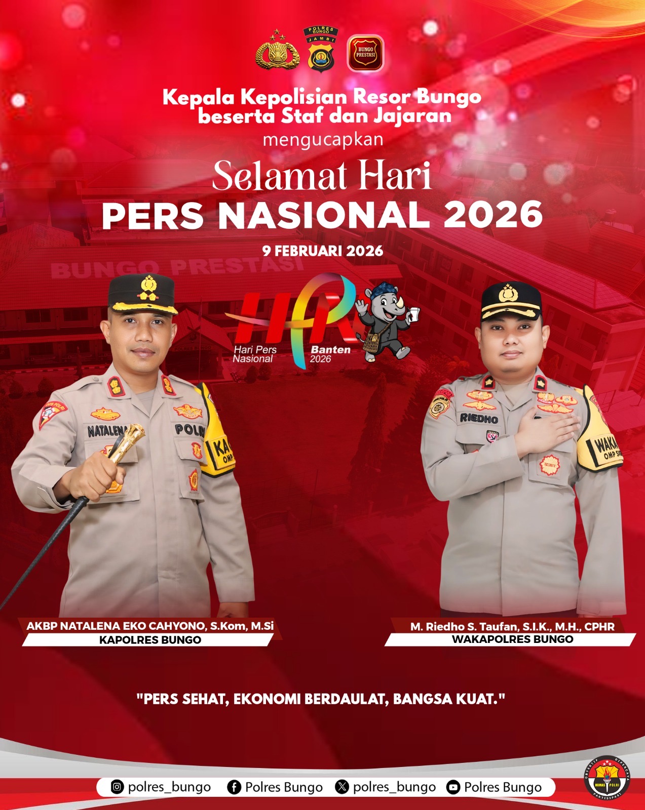 Tjnews,BUNGO-Kepala Kepolisian Resor Bungo ,AKBP Natalena Eko Cahyono, S.Kom,M.Si, bersama Staf dan seluruh jajaran Polres Bungo mengucapkan Selamat Hari Pers Nasional (HPN) Tahun 2026 kepada seluruh insan pers, khususnya jurnalis yang bertugas di wilayah Kabupaten Bungo, Provinsi Jambi.