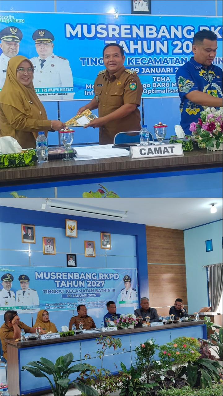 Kegiatan musrenbang tersebut dibuka secara langsung oleh camat Bathin III Juprizal SP, serta dihadiri oleh Ketua DPRD Bungo dari dapil I ,rindang dari fraksi PDI Adapun hasil musrenbang tersebut mencakup beberapa aspek skala prioritas seperti pembangunan fisik yakni pembangunan jalan ,pengembangan sektor pendidikan dan Kesehatan, pemberdayaan ekonomi masyarakat, dll .Adapun hasil Musrenbang nantinya akan diteruskan ke tingkat kabupaten untuk dipertimbangkan dalam penyusunan Rencana Kerja Pemerintah Daerah (RKPD) tahun 2027.