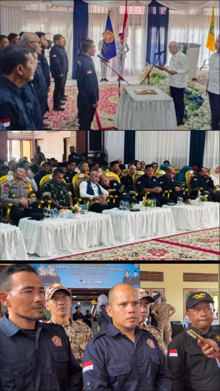 Tjnews,Bungo-Pengurus Karang Taruna Kabupaten Bungo periode 2025–2030 resmi dilantik, pelantikan ini digelar di Wisma Ali Sudin dengan mengusung tema “Karang Taruna Bersatu, Menuju Bungo Baru”.
