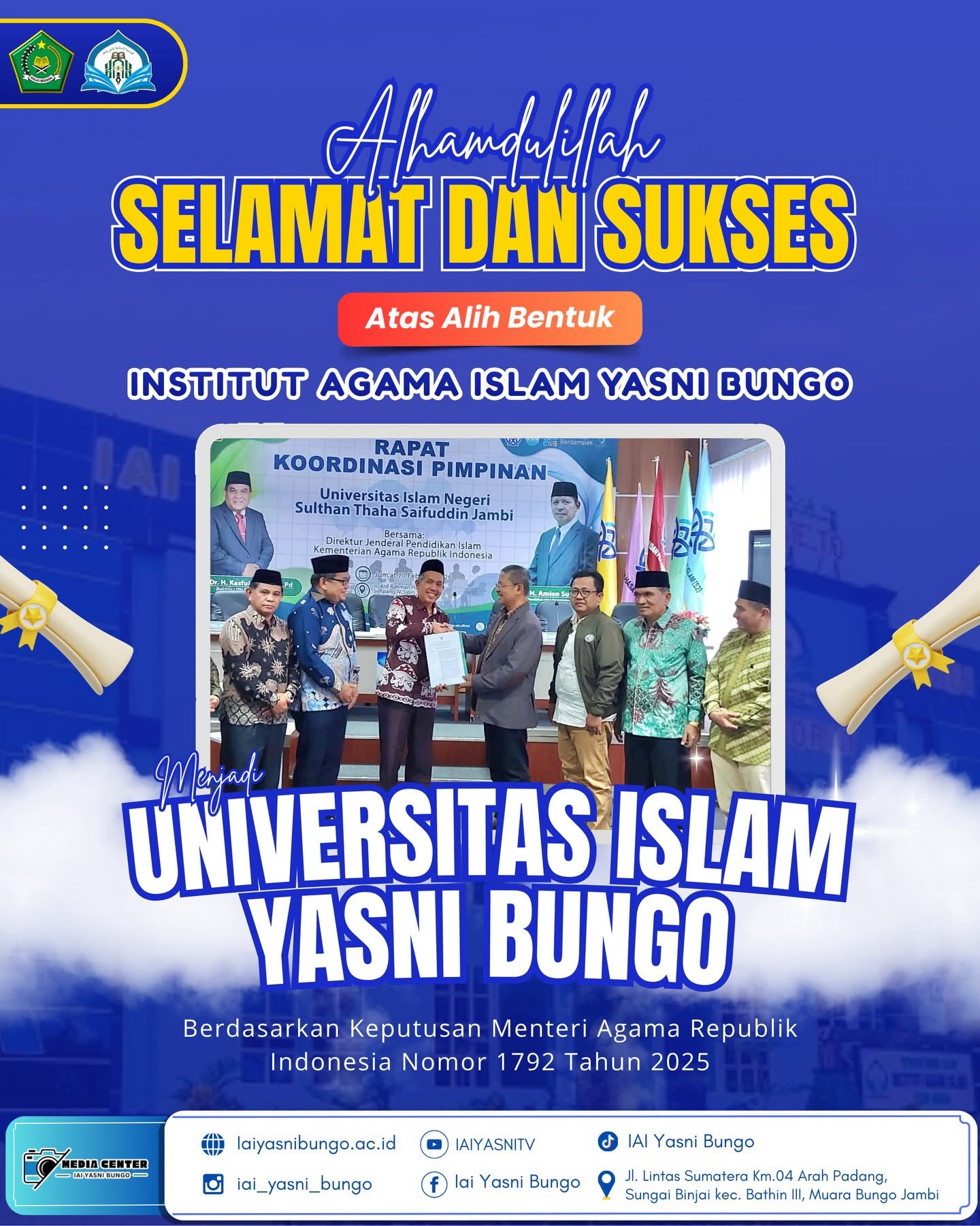 Tjnews,Bungo-Perubahan status Institut Agama Islam (IAI) Yasni Bungo menjadi Universitas Islam (UI) Yasni Bungo ditetapkan melalui penyerahan Surat Keputusan (SK) oleh Kementerian Agama Republik Indonesia, Jumat (20/02/2026) di Jakarta.